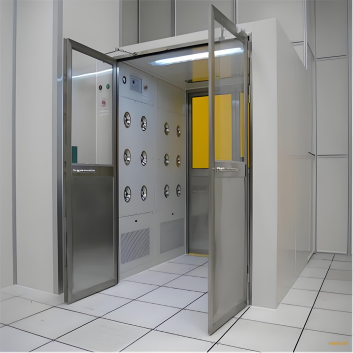 在电子车间,风淋室的作用也是比较关键。芯片制造对环境洁净度要求极高,哪怕是微米级的尘埃附着在晶圆表面,都可能导致电路短路、良率下降。风淋室作为洁净第一道关卡,通过严格清除操作人员衣物上的纤维、毛发等杂质,将车间洁净度维持在 ISO 5 级(百级)以上,为芯片封装、半导体焊接等精密工序提供稳定的洁净环境。