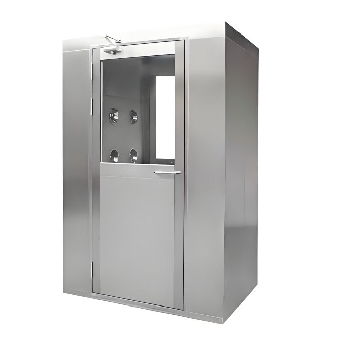 风淋室(AIR SHOWER)是人或物料进出洁净区必需的通道,起到气闸和净化的作用。它利用风机抽取风淋室内部的循环空气,经初效、高效过滤器过滤净化后,将洁净气流从喷嘴高速喷射到人和物料表面,迅速清除人身服饰或物料表面带来的尘埃粒子及细菌,并将吹落的尘埃粒子和细菌经循环气流吸收和容纳在初效、高效过滤器内。
