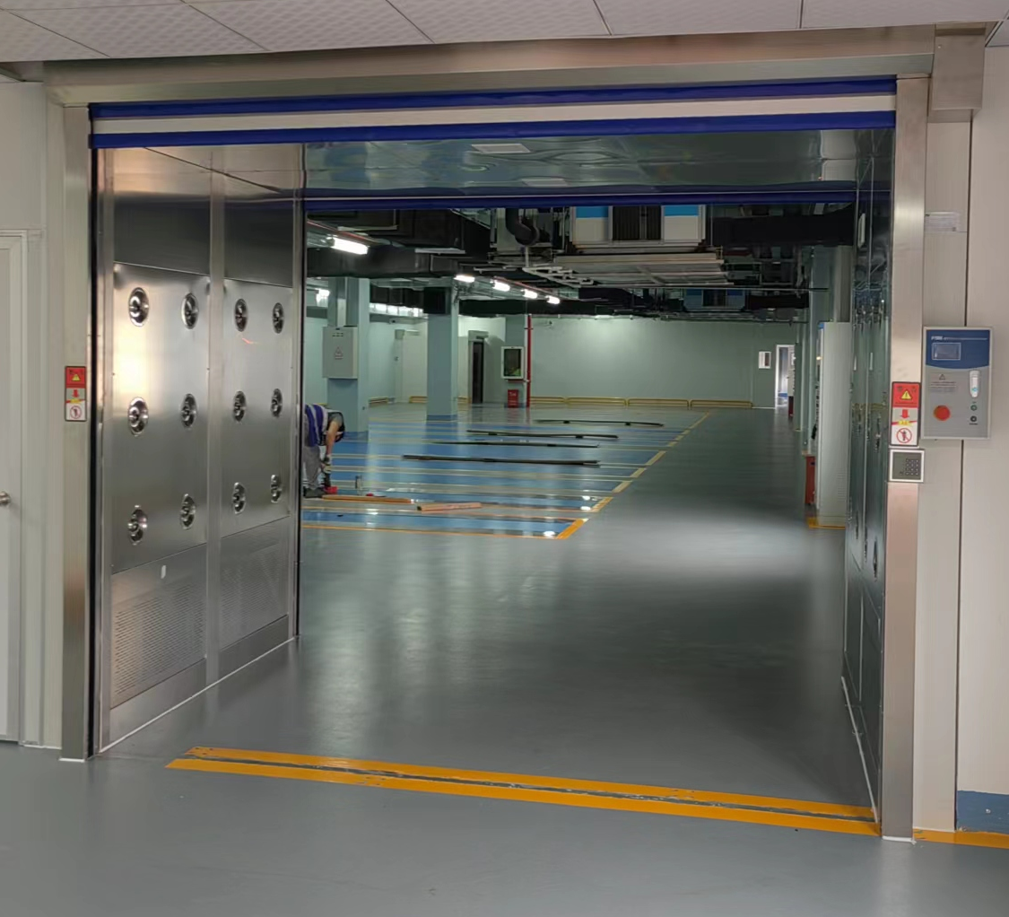 6、进入时按按钮前面卷帘门自动打开,进入货淋室感应吹淋,吹淋完毕后,里面电动卷帘门自动打开,走出货淋室到洁净车间,里面出来手动按钮开门;
