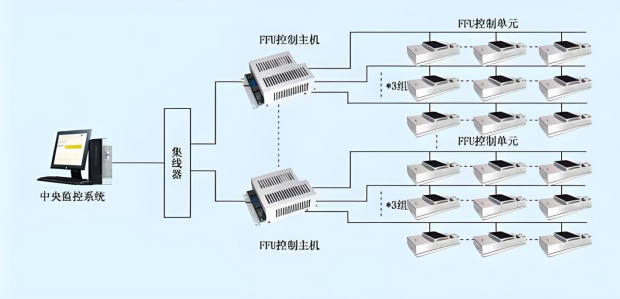 产品概述:FFU作为一种常用净化设备,目前在各种洁净工程中得到广泛应用,FFU群控系统是将几十个、几百个、甚至几千个FFU通过机身上的通讯模块,将信号通过RS485网络传输到中继模块、集成交换机等进行反馈,其信号连接起来并进行监控,并可上传至主机电脑,由电脑远程实现风机的启停、故障报警分析、风速调节等功能, 还可以按照客户现场FFU平面布局图进行程序设计控制界面。